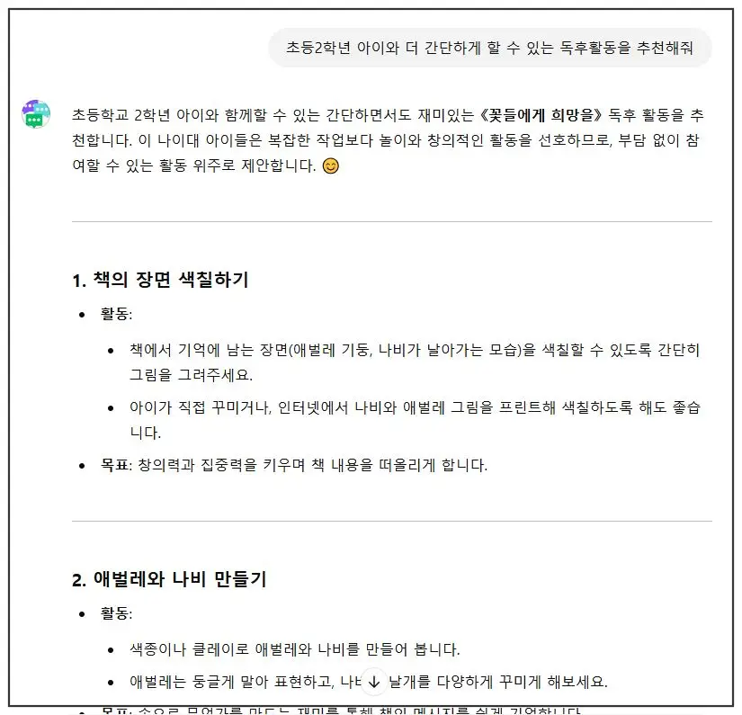 대답한 내용으로는 책의 장면 색칠하기, 애벌레와 나비 만들기, 나비 날개에 꿈적기, 간단한 이야기 다시 쓰기(만약 애벌레가 나비가 되지 않았다면?), 역할극 놀이, '희망'단어 놀이, 간단한 감정 나누기(애벌레의 기분은 어땠을까?) 등으로 원래 활동보다 조금 더 간단히 할 수 있는 활동으로 추천해 주었다. 질문 시 아이의 나이를 넣거나 원하는 활동을 자세히 질문을 한다면 더 정확하게 답을 들을 수 있다.