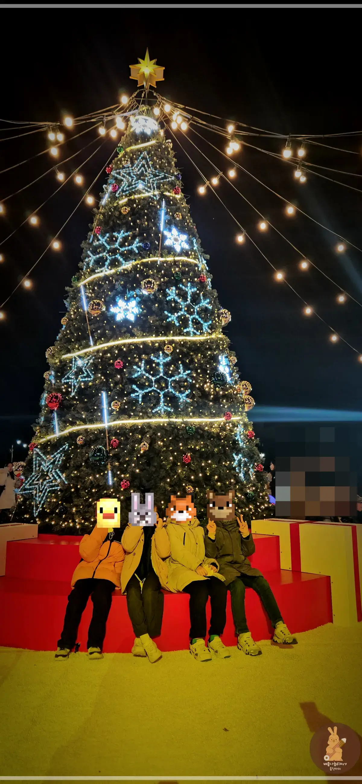 불꽃놀이가 끝나자마자 사람들이 메인광장의 트리에서 사진을 찍기 위해 달려 나갑니다. 미리 찍어도 되지만 불꽃놀이가 딱 끝났을 때 해가 져있고 가운데 대형 트리가 반짝이고 있어서 그냥 지나 칠 수 없게 만들거든요. 저희는 트리 뒤편에 자리를 잡아 아이들 사진을 찍어주었어요. 트리 주변도 북극곰이 있고 포토존이 많아서 마음에 드는 곳에서 사진을 남기길 바랍니다.